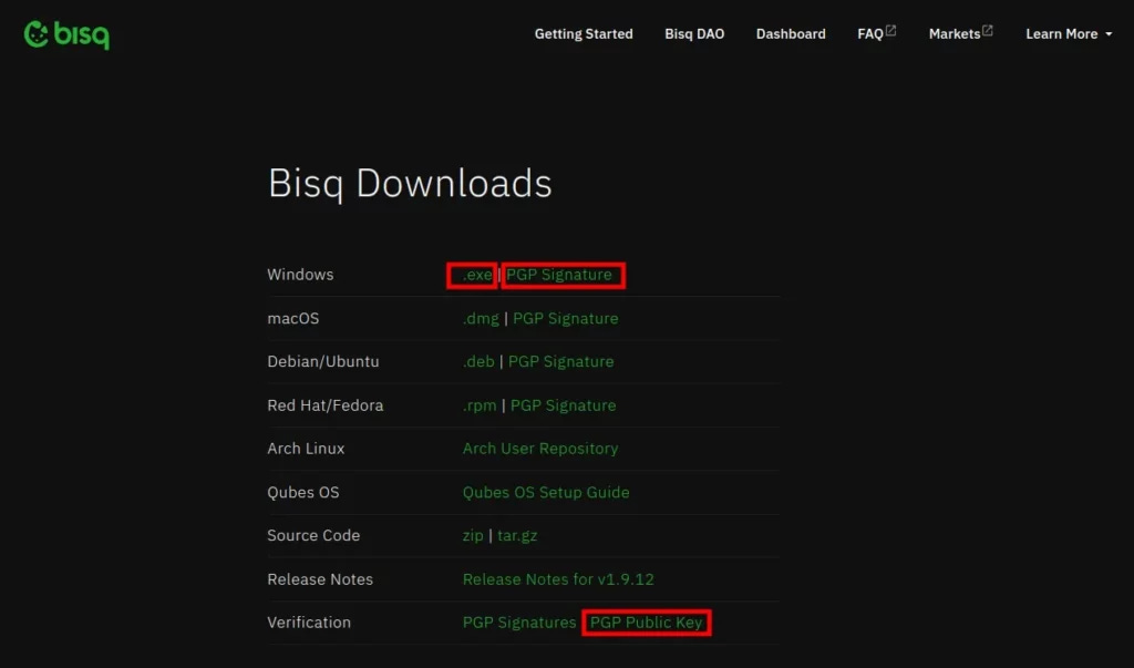 Browse to https://bisq.network/downloads/ (be sure of spelling as well as “.network”) and download the files for your OS. Also download the PGP Signature and PGP Public Key files as these are needed for the verification process.