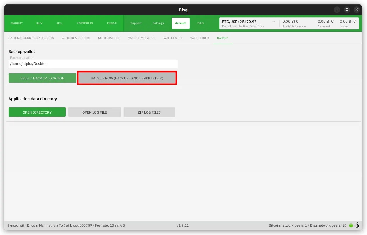 Thankfully Bisq makes this super simple. Just head over to Account -> Backup and click the big button. It’s recommended to do this at regular intervals and you should be aware that the back isn’t encrypted.