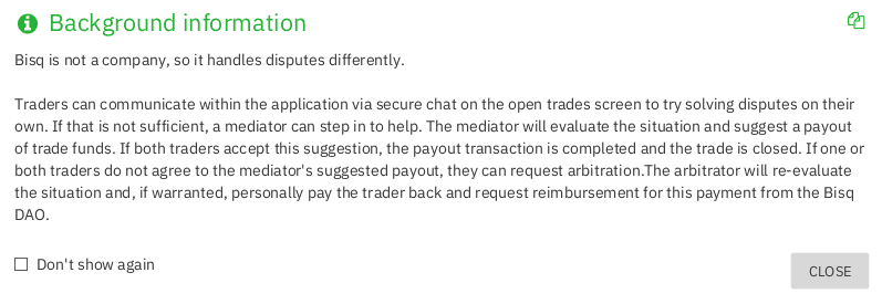 If there’s any issues Bisq also has a very well established and fair dispute resolution process. This involves multiple levels including a trader chat, mediation where a real (randomly selected) human is brought in as an unbiased third party and finally arbitration
