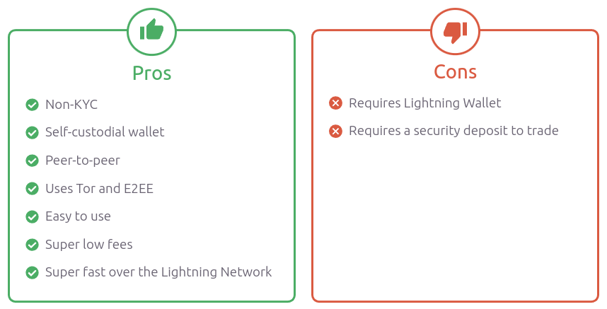 RoboSats is a P2P exchange that only allows buying and selling Bitcoin with fiat over the Lightning Network. It gets almost top marks as it aces all our tests besides the Centralized / Decentralized one. While it is currently not decentralized, it has future plans for Federation and doesn’t require KYC info.