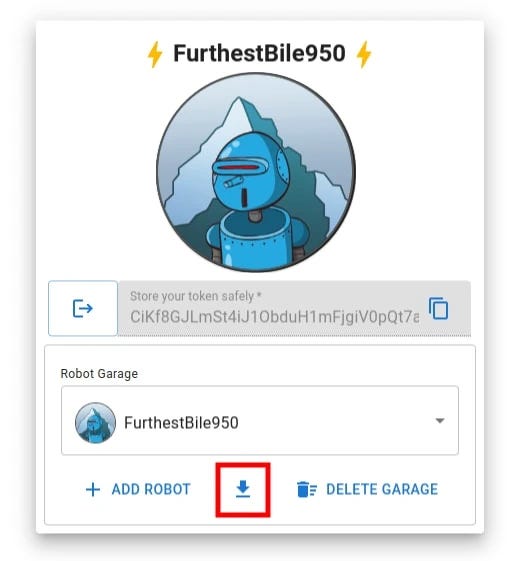 Click the download button in the middle to save it. It’s important to save this as if you’re part way through a trade and your browser crashes, your mobile phone dies or just otherwise stuffs up, you’ll need it to get back to your trade. It’s recommended you generate a new robot for each trade as this maximizes privacy.