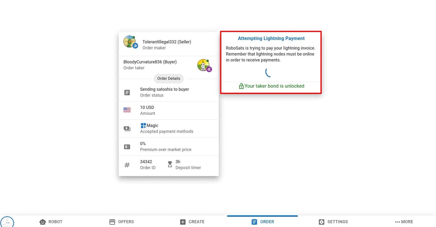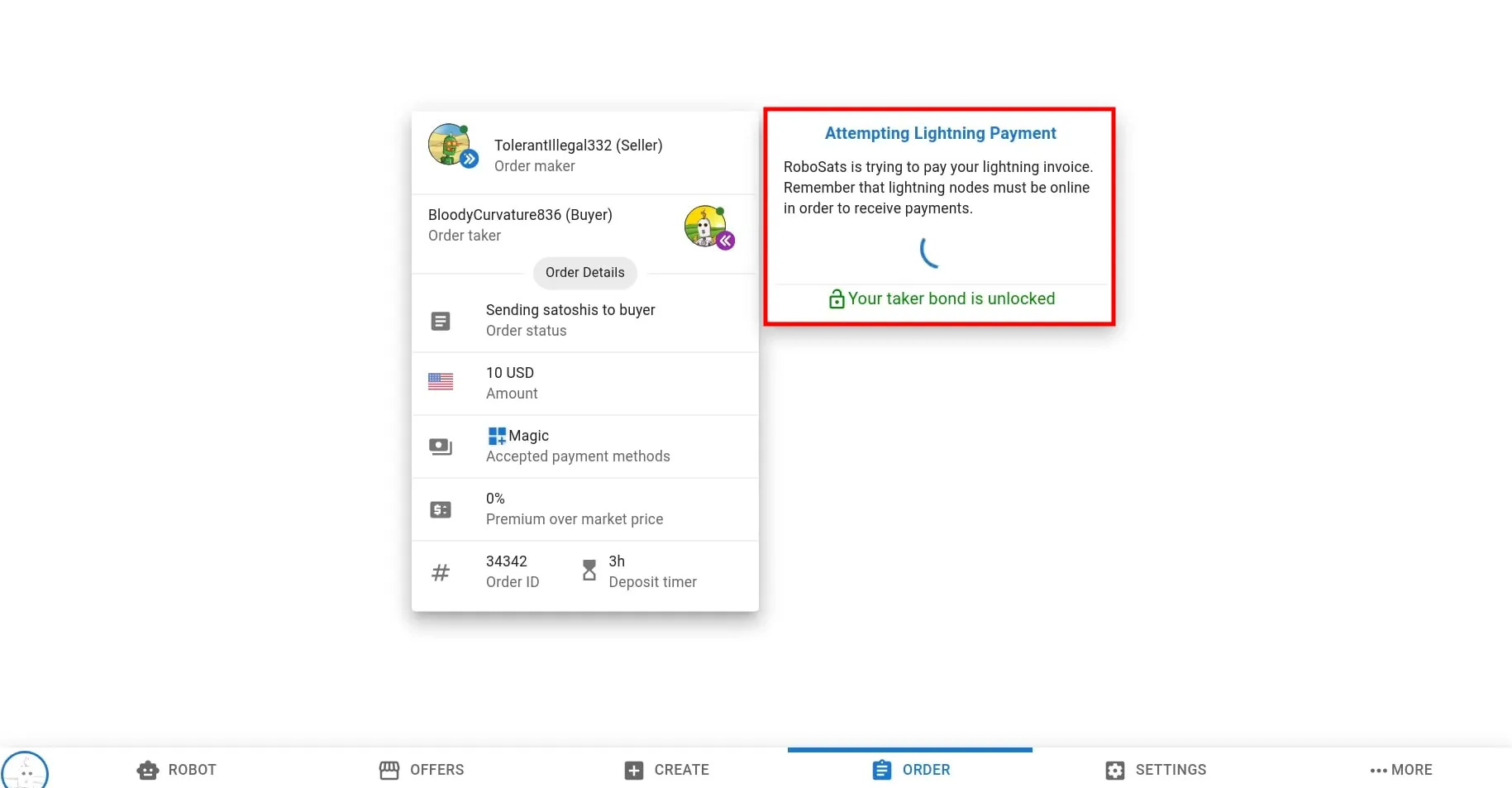 Once the seller releases the bitcoins RoboSats will be sent to the Lightning Invoice you provided at the start. If the invoice or payment fails for any reason RoboSats will automatically retry 3 times with a 1 minute pause in between.