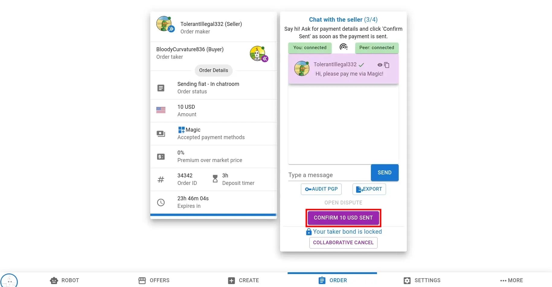 Once the seller has locked up the bitcoins being traded in escrow, RoboSats will open up an encrypted chat with the seller. It’s now safe to send the fiat to them. While chatting, make sure you don’t share any more information with them than you need to. Once you’ve sent the fiat, click Confirm X USD Sent