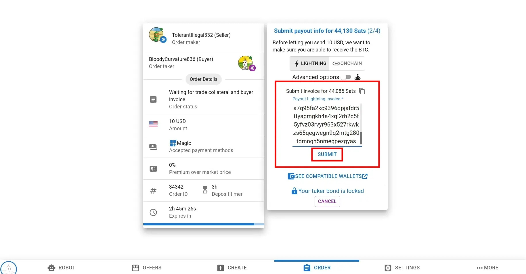 Once the seller has confirmed they’ve received the fiat, your bitcoins will be released and sent to the Lightning Wallet invoice you entered in Step 2. Your bond will also be automatically returned to you too.